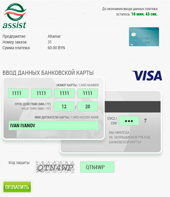При оформлении заказа на сайте выберите способ «Оплатить сейчас онлайн», далее — «картой Visa или MasterCard» (в том числе если оплата производится картой Белкарт). После подтверждения заказа вы будете перенаправлены на сервер системы Assist, обеспечивающей безопасность платежей.